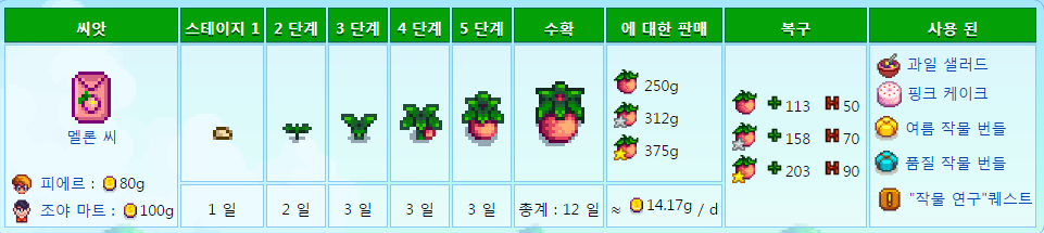 개당가격이 비싼편이므로 가공하여 판매하느것을 추천합니다 (멜론와인 1125골드)